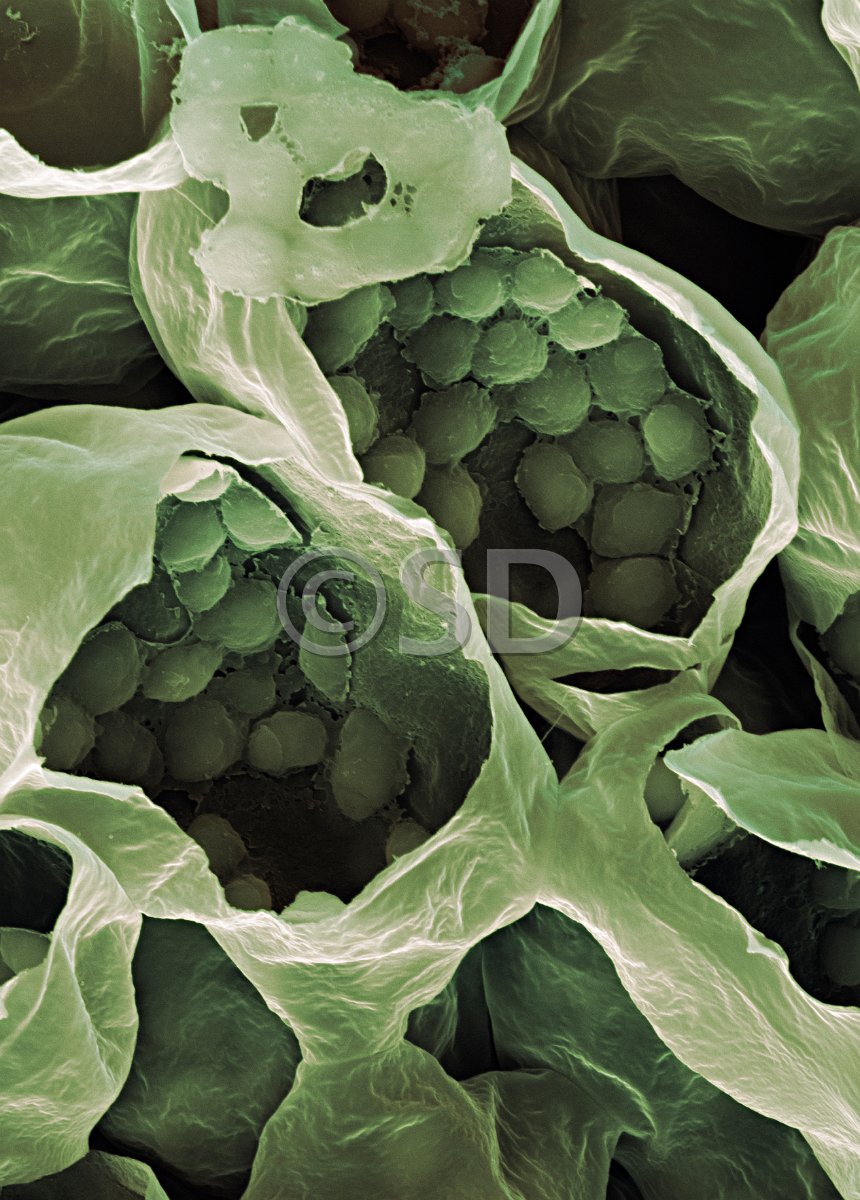 279Azolla anabaena Broken cells. This plant has a symbiotic relationship with Anabaena cyanobacteria, where the cyanobacteria doubles the rate of photosynthesis and fulfils the nitrogen requirements of the plant. Field-of-View: 66 x 93 micron