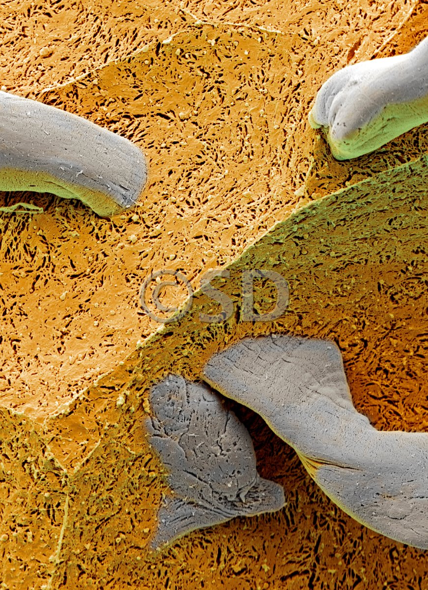 126Tooth of a mouse Sheets of dentin on the inner side of a rodents (mouse) front tooth from the lower jaw. Specimen preparation: Dr. Georg Krohne, Div. of Electron Microscopy, Biocenter - Wuerzburg University Field-of-View: 178x249 micron